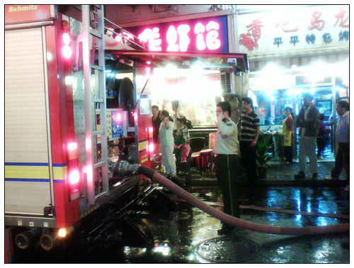 晚上吃饭的餐厅33号,隔壁13号着了火,消防武警来了,抬出伤者一名。