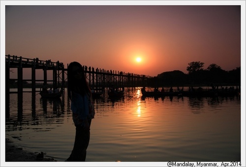 3.曼德勒,乌本桥的落日。 300多公里,预计车程6小时,中途停顿了一次吃饭,两人份的套餐2美元,一份酸咸的汤,肥瘦相间的腌肉,一盘炒不知名的树叶,一盘炒豆子,还有3大碗不知名的调料。穿过峡谷的时候,拍了佛塔下的牛羊成群,然后就是漫长的车程,听了许多缅甸的流行歌,比我想的要到的早,与仰光相比,曼德勒(Mandalay)更接近大城市。西风桑拦到了车,却是摩托车,驾车男孩很年轻但很不专注,一路不停回头和我交谈练习口语,这让我对路上频频飞驰插肩而过的汽车十分恼火,一路担惊受怕好容易到达客栈。客栈的电梯按键竟然是全触摸式的并带有WIFI,虽然不高科技但是在缅甸这个国家遇见还是有很大一番惊喜的。 小歇了一会,约了车去马哈牟尼(Mahamuni)和乌本桥(U Bein Bridge),尽管距离皇宫只有2条街但走走却要绕过半个皇城,于是果断的放弃,同时放弃的还有上曼德勒山鸟瞰全城,只是初初的一瞥,对曼德勒的印象却很一般,实皆(Sagaing)、茵瓦(Inwa)、敏贡(Mingun)、阿马拉布拉(Amarapura)四大古城,最后只因为乌本桥而来到阿马拉布拉。不得不承认,我留给曼德勒的时间很少,是因为一开始就对“看千人吃饭”这个恶趣味的景点充满着排斥,还是因为这里离天朝太近行乞之人的拉扯也那么相似? 司机准时来了,话不多,等待的时候坐在马路牙子上神情笃定。马哈牟尼佛塔里,有一群衣着鲜艳的少女,笑起来一扫阴霾,贴金箔的内殿只允许男子进入,幸亏我有长焦镜头可以一窥。泼水,是种敬意,把星期一到星期八都通透的淋了一遍,虔意但是不祈愿,为自己请一串星期一的佛珠。 赶到乌本桥时,正好夕暮。有人说,不要和船夫还价,因为一天之中他们也就黄昏会有那么一单生意。湖面上星星点点有些小舟,都集中在桥的一侧头尾相衔等待着夕阳西下。走上东塔曼湖上这座全长1200米的全柚木的桥,传说中的爱情桥,从此端到彼端,僧人的红袍在落日余辉下显得更加浓重,见到了蒲甘佛塔上遇到过的一些人,人少便有这点好处,来来往往都是似曾相似的脸,都在彼此的镜头里。 日落果然很美,桥身的木栅在绯红色天空下的剪影,水面涟漪匀上玫瑰色的倒影,还有那些尖尖的小舟让静谧的湖面生动起来碎裂的波纹荡漾闪闪的暮光。缅甸有着世界上最梦幻的日出和日落,如果蒲甘的日落是封尘时空的,那么乌本桥的日落是安逸的,不带有任何的落寞,一呼一吸间饱满的尘世间的烟火,有些暖意也有些笑意,给一天一个美好的结尾。 在街上问路,会讲汉语的人很多,随时可能就冒出来一个路人甲,有些上年纪的,会很兴奋的为你指路,聊了几句,他们出生在缅甸但是父母都是华人。曼德勒有很多人是掸族,源于怒江、澜沧江中上游地区的哀牢人,和阿洪族、佬族、泰族还有傣族的语言一样属于壮侗语系,吃晚饭的时候就遇到一个。老板娘和热情的招呼我们,说着不流利的汉语,但是看得出她有机会说汉语的时候是那么高兴,她说她的妈妈是傣族每三个月就回一次版纳,而她一次也没回去过。同样是缅餐,这一顿饭吃得很欢喜,连同喜欢起曼德勒来,继续是全素,我琢磨着点菜的西风桑是不是有出家的念想。 天亮以后,西方桑将去茵莱湖和小龟、兰亭大师会合,群里有人辗转去了密支那(Myitkyina),一个不接受军政府统治的掸邦独立地区,曾在1993年宣布脱离缅甸联邦独立建国。而我就要告别缅甸,大多数国家的历史都是过去完成时,但缅甸的进程却是现在进行时,第八兵团的金三角应该也还有人记得,这一页不应该被忘记。 离境的时候,并没有要求强制安检也没有说缅币不可带出境,给自己买了条缅丝的特敏裙(TaMane)用来纪念。