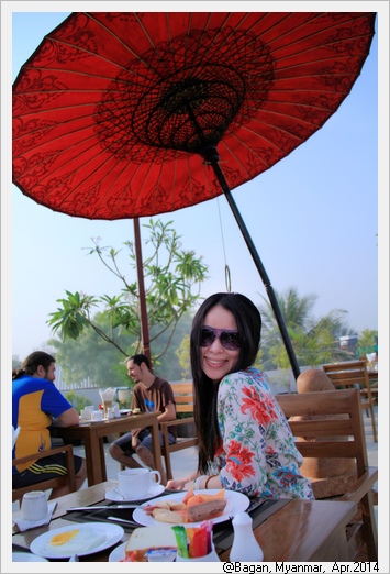 从五点到十一点,随着烈日的温度,我们决定休整,下午三点继续活动。同车的人几乎都住在新蒲甘,西风桑在司机的推荐下住到了娘乌(Nyaung U)附近一个非常LOCAL的客栈,后来证明这的确是一个性价比非常高的选择,以至于翌日我们把它又推荐给了新到的兰亭。当然众人对于我和我的室友小龟毫不犹豫选择住在旧蒲甘佛塔林中的小别墅唏嘘不已,一口一个高大上。等待从小龟从曼德勒过来的时候,我和西风桑顶着骄阳徒步20分钟到达娘乌镇上,中午的美食街有些冷清,店面暗漆漆的,挑了一家有人气的,因为它在十字路口两面通风显得明亮,在问WIFI的ISSID的时候,居然发觉这是一家名字奇怪的餐馆,叫做Weather Spoon,我这种外星来的神秘孩子,若不是实在热趴下了,一定是要去对这个名字探究一番的。 在我寻思是凯撒色拉还是培根色拉配个什么肉排的时候西风大爷已经直接点了西红柿色拉一份炒饭,在我殷切地盼望之下,终于还点了Myanmar啤酒,随着啤酒送上来还有一些碟花生,也在这一顿饭开始,进入了著名的三炒时代:炒饭、炒面、炒米粉。菜单上的主食毫无意外都是fried开头,然后括号内可选鸡肉猪肉和蔬菜,而丝毫不用考虑的就是西风桑永远都会给大家选择蔬菜。因为热,也因为暴日下走了数公里,一瓶啤酒迅速的在几口之间被干完,麦芽很淡果然清口,在西风桑的无奈注视中我继续点了两杯果汁,然后与老板商量着要自选MIX。也许是芒果加椰子的香郁,连300Kyat还是400Kyat一瓶矿泉水都要纠结很久的西风桑最终没忍住,于是又加了一杯。