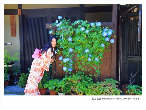 古街离车站不远,从白川鄉回来的时,我们把行李堆在车站一隅的角落便径直离开了,日本的治安一直让我很放心,严谨的秩序背后哪里都逃不了反向压抑形成的极态,但光天化日下却比哪里都要彬彬有礼井井有条欣欣向荣。古街是个井字结构,三町筋周围人烟熙攘热闹起来,台湾客人和西人较多,日本的孩子穿着振袖的和服背后的兵儿带扎得显眼瞩目,一路买了各种小吃,两只手都握满了。黑檐的木屋下,纵横白色格子的窗,几家楼前都盛开着蓝紫色的朝颜花,我大喜,左拍右拍为难了摄影师。 阵屋里,游人也不多,一间一间屋子看了过去,大屋里面有烧柴取暖的暖炉,平时烘着一壶热水。长廊上铺着草席,一路奔跑,然后在水榭边躺下,有西人对着我拍照,小五说,看,果然被人当成了女优了吧。倚着中墙,垂眉低首,看上去很乖,恬静中仍然能察觉一丝淡愁,其实,那是真的,即便欢笑时,都各有心事。胸中有无大志,一早是看得出来的。