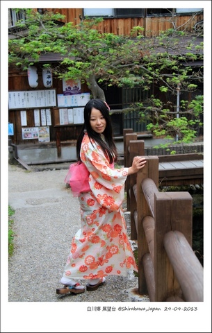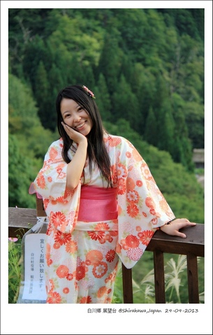 村居容易醒得早,换个方向溜达,和田家的大屋曾是有权势的家族现在变成合掌部落的博物馆讲解这日式的建筑,山里冷,穿了袷衣的和服,土色四季柄,幅带甚宽有些不适应,费了好些时间又让小五帮忙勒着才穿戴完毕。转水车的时候,被一群西人要求合影,小五啧啧的咂嘴,我知道他定是想说那句话,恨恨。 村里好像没有太多的年青人,每幢合掌屋大多都是老人独居,世代传袭下来的祖屋,每隔三五十年便要重新换一次屋顶上的茅草。白川鄉的民宿有个统一的预订网,一律假名,看不懂便如同猜谜,我有时回头想,提供食宿,一来人来人往排解些寂寞二来也可以增添些日常收入,日本人爱干净,离开时借住过的屋子也打扫地干干净净并带走垃圾,并不增加麻烦。时间在走,一切迟早变化,有些事情谁又知道长远呢。
