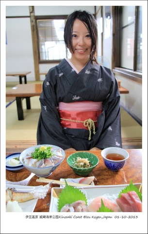 早餐时遇到另一位投宿的西人,替我们拍了合影,店家送我们去巴士站前往城崎海岸。这是一段里亚式海岸线,两边都是陡峭的断岩,海浪拍打着礁石溅起朵朵海花,一段长长的吊桥走得童趣盎然。下了雨,小五掏出一把黑布伞,有些丑,他的理由是谁叫你穿玄色猫柄的和服,正好相配。这是件夏季着物,薄但又不似高织棉上了浆那么服帖要衬肌襦伴,出门时阿巴桑为我前后忙碌穿戴地道停当,走了些山路,还是端端正正的。海岸线的步行道很长,差不多有9公里,雨幕中看不到远处的大室火山(Omuroyama)。 闯入农家吃午餐,点的海螺上桌个头被店家笑盈盈地翻了个倍,鱼生盖饭片片晶莹,满口虾蟹的鲜甜。榻榻米是旧时的样子没有改良,中间没有搁脚的落坑,正襟曲膝跪坐着,刚想偷懒便被一个戏虐的眼神瞪回来。你到底带了几件和服呢?除了箱子里还没穿过的,家里还有琉球红型染的一件、正绢蝴蝶的一件……还没说完,就看见对面吃饭的人倒了下去。 回到旅店休息了会,喝了壶玄米热茶,店家又送我们去JR车站,这些天来的第一场雨,一直在下,伴着高原海边的潮气,竟然轻盈地以为那是一条跨越六界的路。