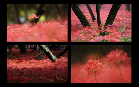 彼岸花。生长在三途河边的接引之花。能唤起死者生前的记忆。 彼岸花。花开开彼岸,不见花,不见叶,三界以后,五行之外。 彼岸花。开在黄泉之路的花朵,这长长路上唯一的风景与色彩。 弱水彼岸,有一枝花,艳红地燃烧,指引我们通向幽冥之狱。